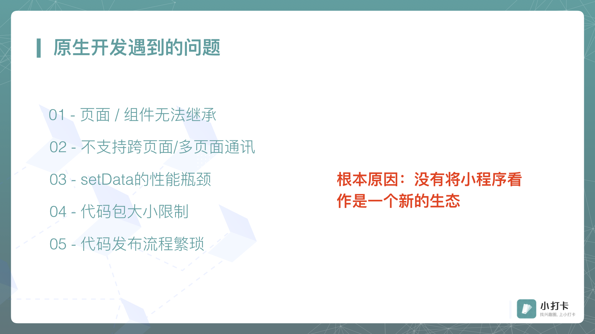 小打卡在小程序刚出现的时候就进入开发了,当时框架还不成熟,而且对创业公司来说时间和迭代效率高于一切,在人手不足,业务模式尚未形成,还处于探索阶段的情况下花费大量时间去做对产品影响较小, 甚至delay迭代速度事情不是很赚