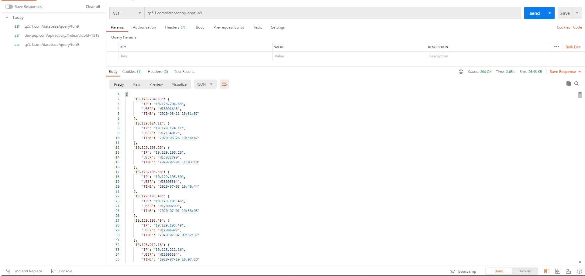 <?php// 查询多个字段 column id 作为索引public function fun10(){$data = DB::table('logs')->where(['OPERATION' => 'SELECT','USER' => 'W18001643'])->column('USER, TIME','IP');return json($data);}