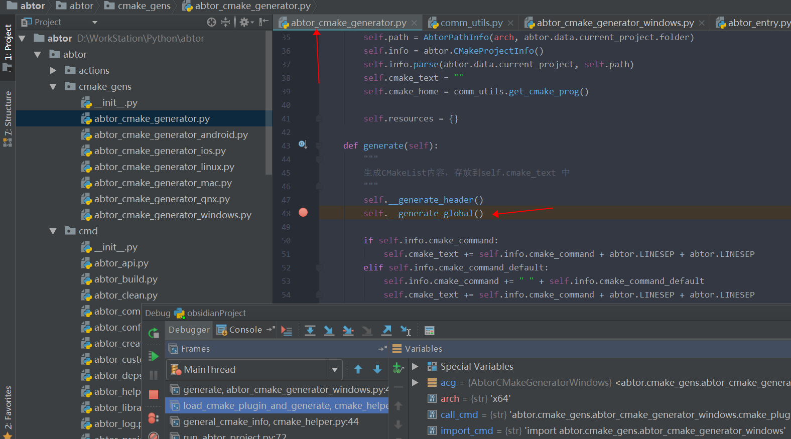 根据结构图,知道主要的功能是生成CMakeList.txt 那么主要调试的位置就应该是写CMakeList的位置,我们假设需要添加某一个特性到CMakeList上,在abtor_cmake_generator.py 的generate() 函数中设置一个断点,看程序的调用关系是怎么样的。