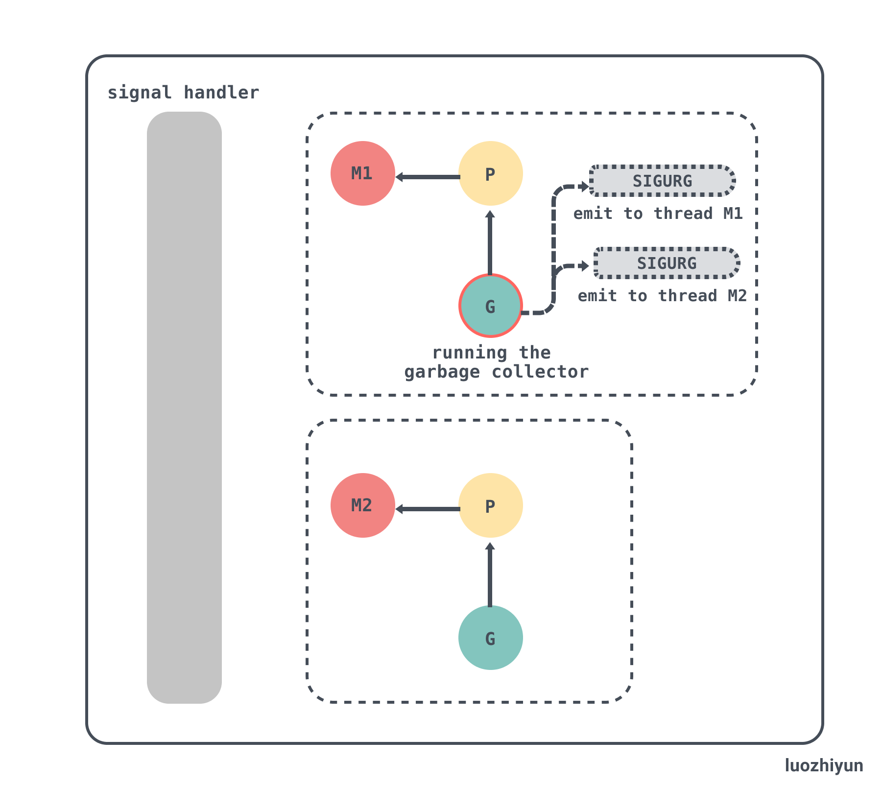 _SIGURG信号的处理函数runtime.doSigPreempt; - 此时有一个 M1 通过 signalM 函数向 M2 发送中断信号