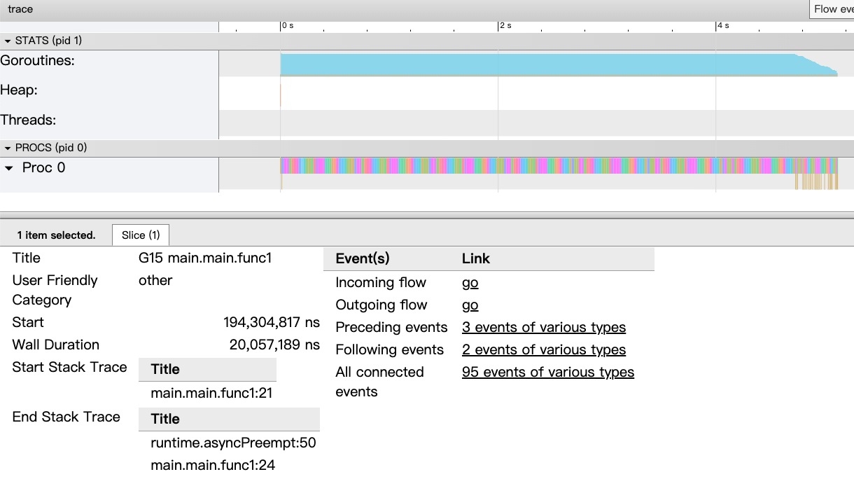 - 随便点击一个 goroutines 的详情栏可以看到 Wall Duration 为 0.23s 左右,表示这个 goroutines 持续执行了 0.23s,总共 10 个 goroutines 执行时间是 7s 左右;