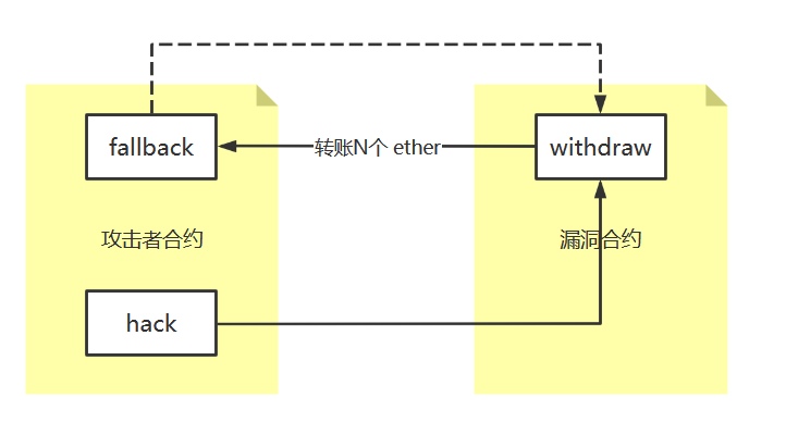 如果构造一个 fallback 函数,函数里面也调用对方的 withdraw 函数的话,那将会产生一个循环调用转账功能,存在漏洞的合约会不断向攻击者合约转账,直到gas耗尽。该漏洞仅针对address.call.value()这种转账方式。
