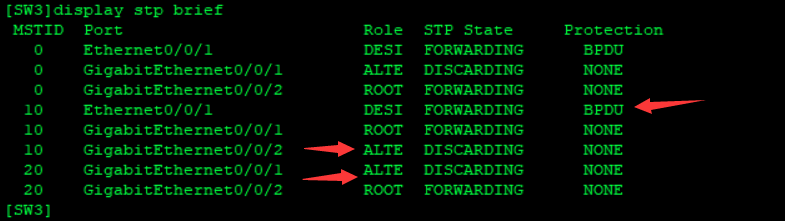 [SW3]stp region-configuration[SW3-mst-region]region-name HUAWEI[SW3-mst-region]revision-level 12[SW3-mst-region]instance 10 vlan 10[SW3-mst-region]instance 20 vlan 20[SW3-mst-region]active region-configuration