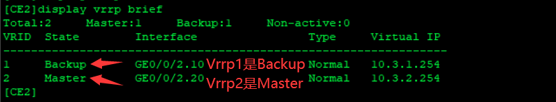 [CE2]int GigabitEthernet 0/0/2.20[CE2-GigabitEthernet0/0/2.20]arp broadcast enable[CE2-GigabitEthernet0/0/2.20]vrrp vrid 2 virtual-ip 10.3.2.254[CE2-GigabitEthernet0/0/2.20]vrrp vrid 2 priority 120