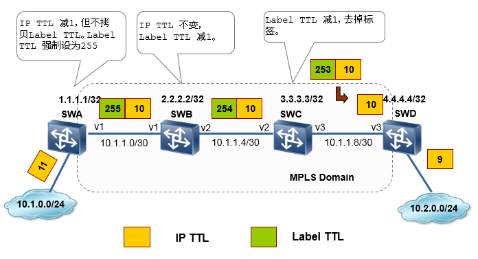 - SWA从IP网络收到IP报文,IP TTL=11,SWA将IP TTL减1,但并不将IP TTL拷贝到MPLS的TTL域,而是设置MPLS TTL为255(IP TTL=10,Label TTL=255)