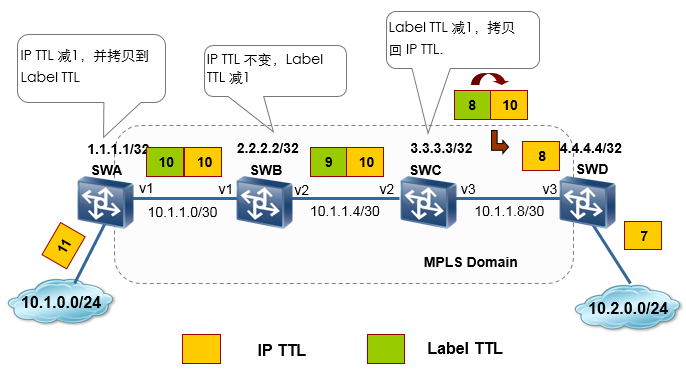 - SWA从IP网络收到IP报文,IP TTL=11,SWA首先将IP TTL减1然后拷贝的MPLS的TTL域(IP TTL=10,Label TTL=10)