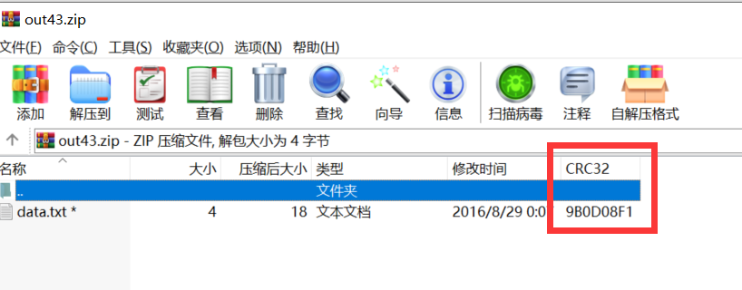 对于本题中给出的加密的压缩包,里面的txt原始的大小只有4个字节,我们可以尝试枚举可能的4字节内容,然后计算CRC32值来进行校验。