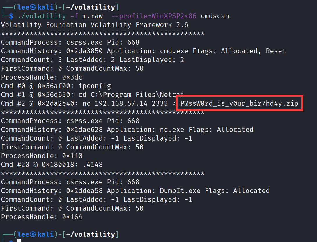 第二问是问电脑的密码,取证分析中,一般这种就是考察windows下密码加密的相关知识,默认密码是hash加密的,也就是说需要对内存文件进行hashdump,用到volatility的这个插件: