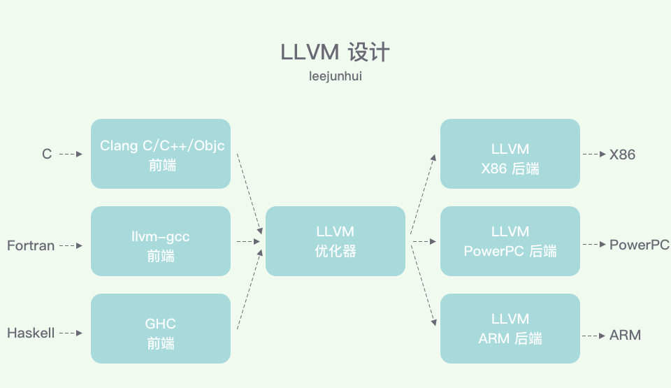 而 LLVM 后端包括代码优化(优化器)和目标代码生成(后端)两个部分。