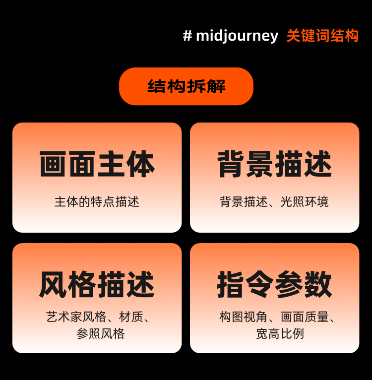 首先我们拿到需求后,利用MJ,将Prompt「关键词结构」拆解成四个部分: