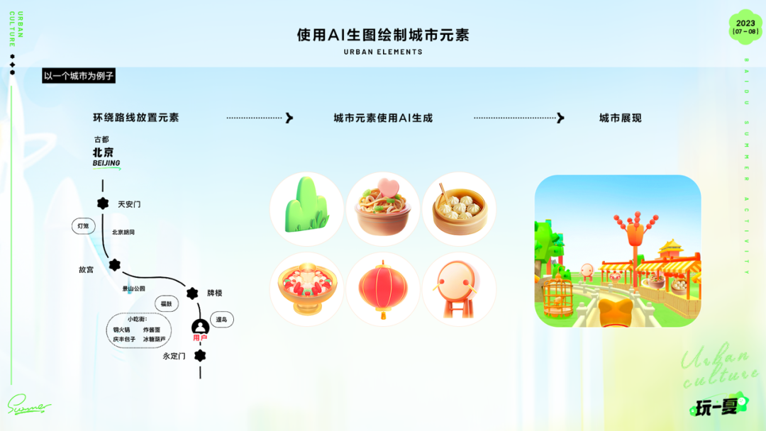 为了增加活动的多样性,我们在每个城市路线的两侧加入了许多具有城市特色的3D元素,而过多的3D视觉会导致活动包体增加,导致活动加载速度降低。为了解决这一问题,我们将主要建筑之外的元素以二维图像的形式呈现,这些二维图像我们尝试使用生成AI进行。例如北京胡同中的大红灯笼、小吃街上的包子和铜火锅,以及城楼前的大鼓等元素,生成后的视觉元素经过简单的颜色和细节调整即可放入整体城市环境中。通过AI生成的二维图像,不仅减小了整个活动的包体大小,提高了用户体验效率,还极大地提升了设计效率。