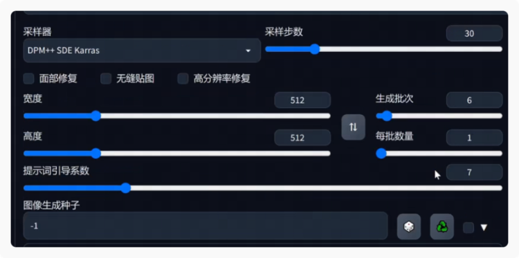 左上方菜单下拉选择需要的模型,本次使用的是国风三大模型,采样器选择DPM++ Stable DiffusionE Karras,采用步数选择30,生成批次选择6
