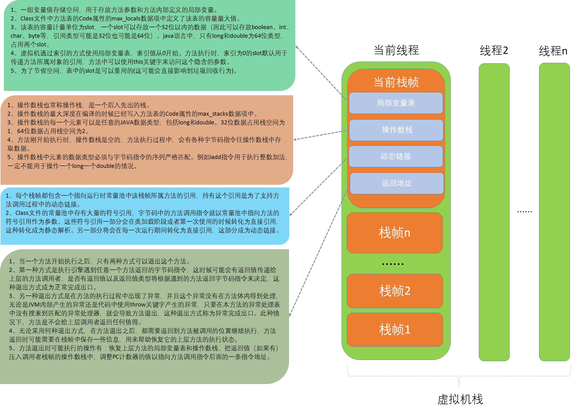 JVM对该区域规范了两种异常: 1) 线程请求的栈深度大于虚拟机栈所允许的深度,将抛出StackOverFlowError异常 2) 若虚拟机栈可动态扩展,当无法申请到足够内存空间时将抛出OutOfMemoryError,通过jvm参数–Xss指定栈空间,空间大小决定函数调用的深度
