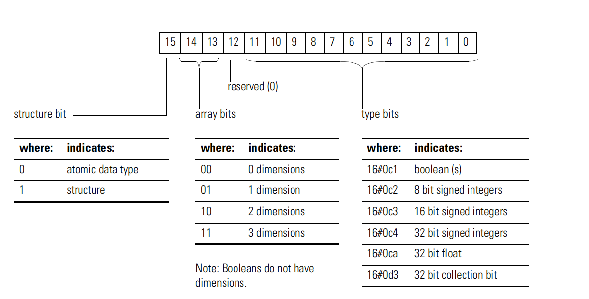数据类型信息在CIP通信的各个方面都非常重要。类型信息用于读取、写入,如果需要,还可以对结构进行解码。下图显示了CIP数据类型的布局。