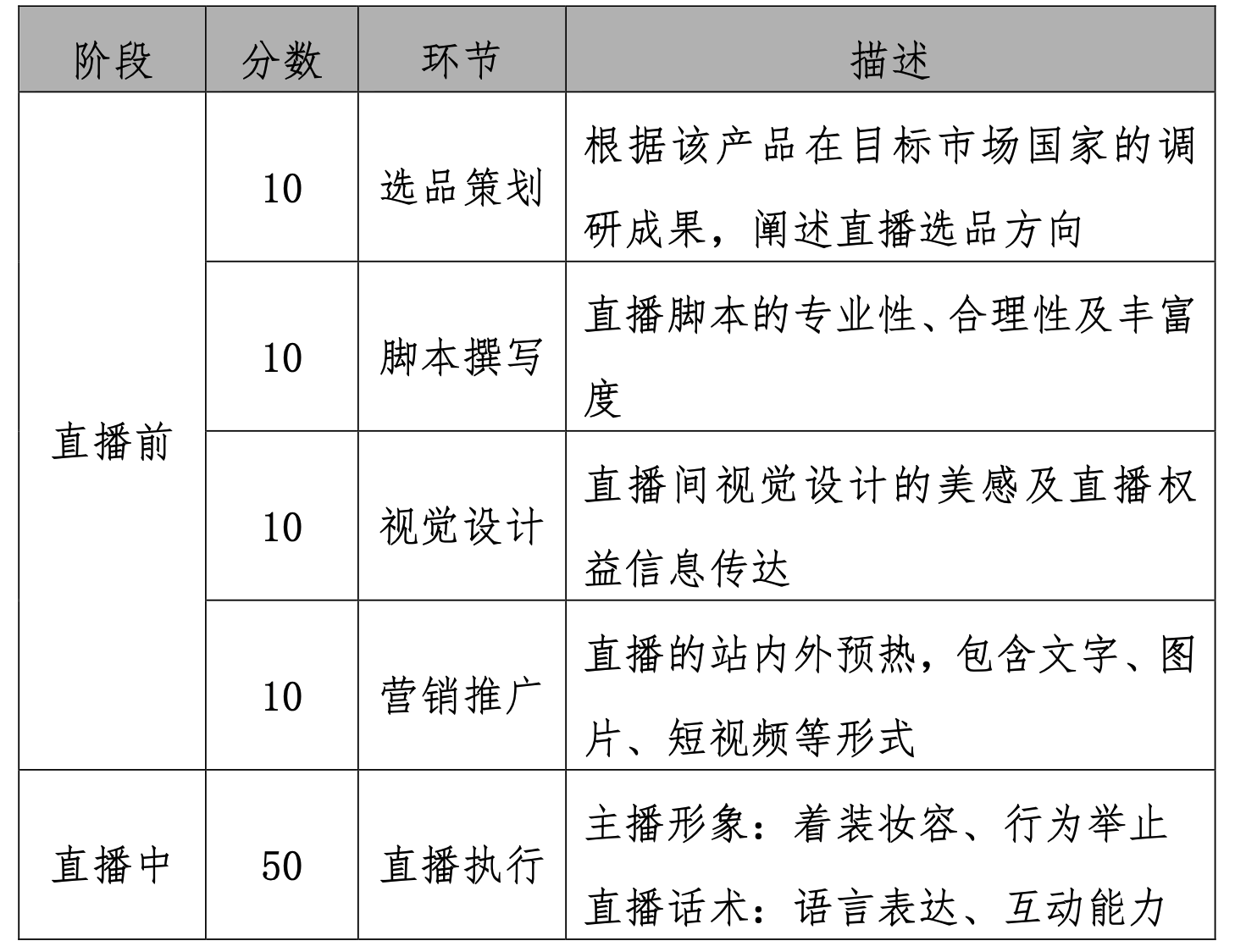 | 3 直播实战赛 | 以速卖通或国际站为竞赛平台,实战赛阶段参赛团队在平台帮助下对接跨境电商卖家,开展直播的选品策划、脚本撰写、视觉设计、营销推广、直播执行、复盘分析等直播全流程工作。 外语直播。 (1)第一轮—模拟直播实战 各团队根据自己的账号人设定位,选择10-20 个产品(由团队自己准备),如消费电子、美妆、家居、服饰、户外运动等,在竞组委指定的网站(见附件一)进行一场 2-3 小时的直播,并将直播前、中、后的过程汇总成报告。由平台和竞组委组织专家网评,选拔出 100 支团队进入第二轮。选拔标准如下。 ![]() ![]() (2)第二轮—真实直播实战 竞组委将提供大赛专用真实选品池,各团队根据人设定位选择 10-15 个样品,如消费电子、美妆、家居、服饰、户外运动等,由平台提供真实样品,在速卖通或国际站平台进 行 3 场 2-2.5 小时的直播实战,并将直播前、中、后的过程汇总形成报告。 分数从高到低推荐,一个赛区的团队数不超过 4 支。 客观数据包括:观看量、互动率、种草率、转化率、GMV 等指标(速卖通)。观看量、热度排名、关注数、留评数、询盘数等指标(国际站)。 |