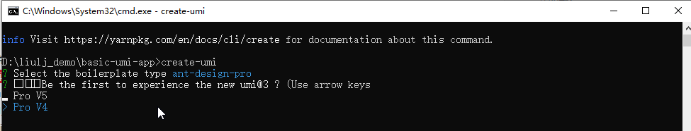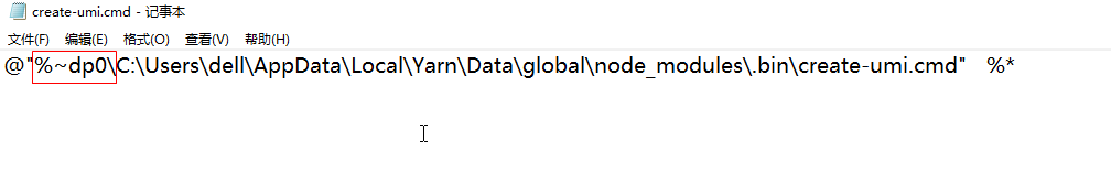 在Windows系统下,盘符前不需要‘%~dp0’符号。将上图红框圈出的部分删掉后保存该文件并执行create-umi命令(注:不要再执行yarn create umi命令,否则这会重新安装create-umi,这样会把之前改过的文件覆盖掉。)