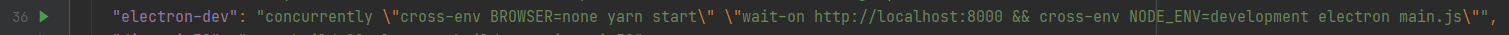 图中第36行是生产环境下electron启动命令,通过cross-env NODE_ENV=production来设置环境变量为“production”表明是生产环境,生产环境下electron主进程是直接执行的打包生成的build文件夹下的main.js文件。