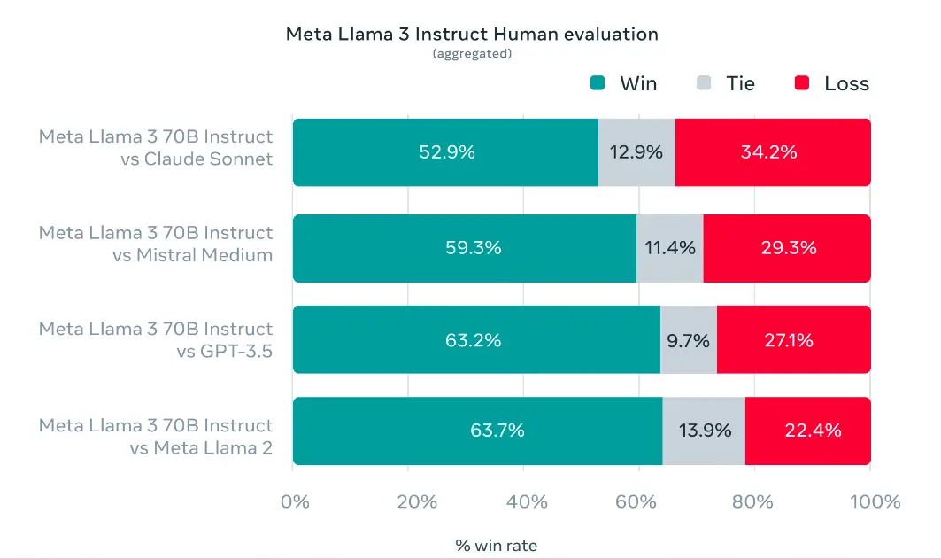 在与 Claude Sonnet、Mistral Medium 和 GPT-3.5 的对比中, Llama 3 同样有着更好的表现。