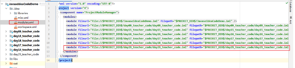 发现在day29_teacher_code模块的配置文件day29_teacher_code.iml中增加了如下一句代码: