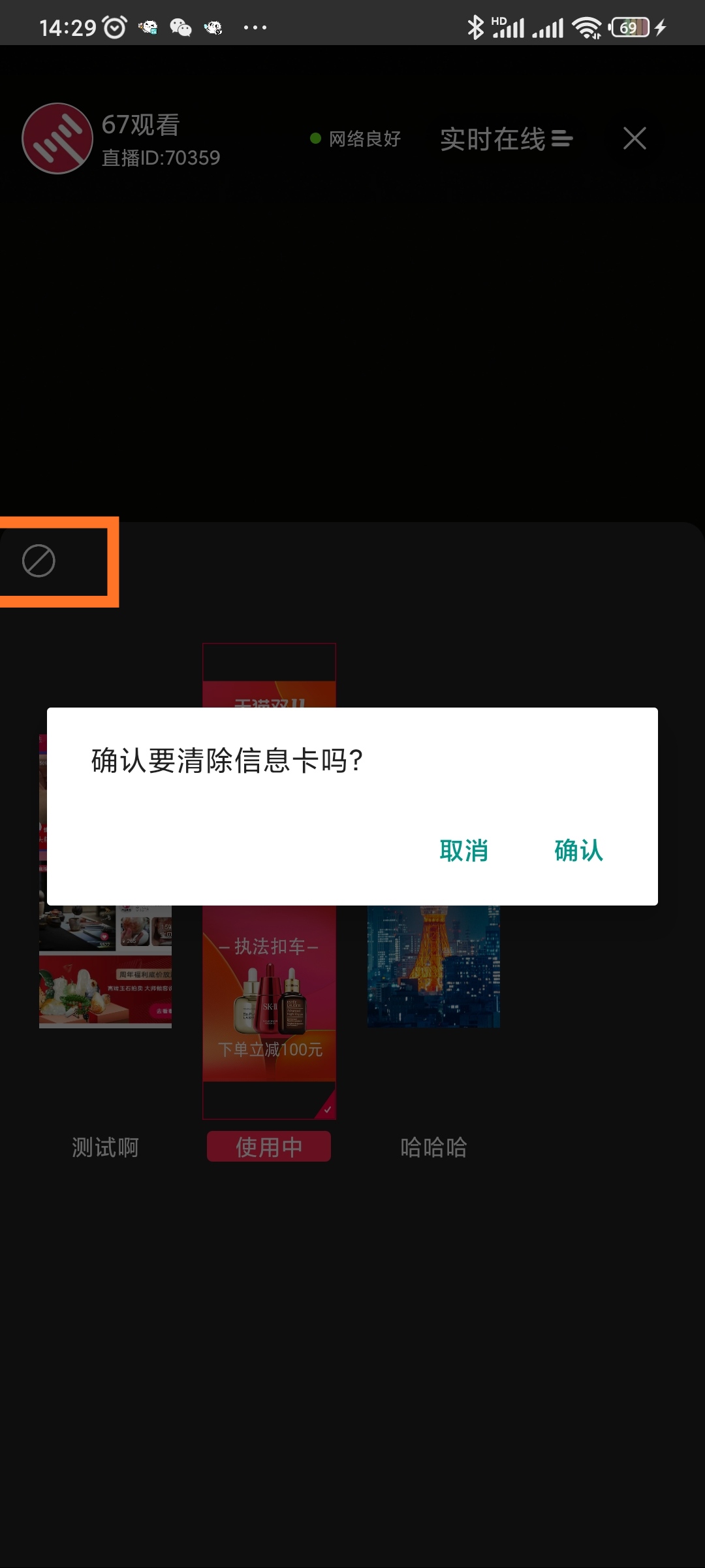 登录淘宝直播客户端,点击【官方信息卡】,然后添加创建好的信息卡即可,取消信息卡,点击取消即可