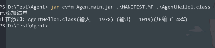 jar cvfm Agentmain.jar MANIFEST.MF AgentHello1.class