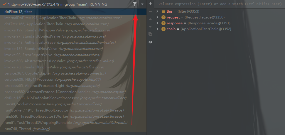 依旧是在doFilter()处下断点,看一下在执行到doFilter()前,调用栈中都调用了那些类的方法