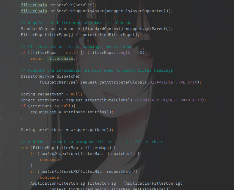继续看后面两个循环,第一个遍历StandardContext.filterMaps得到filter与URL的映射关系并通过matchDispatcher()、matchFilterURL()方法进行匹配,匹配成功后,还需判断StandardContext.filterConfigs中,是否存在对应filter的实例,当实例不为空时通过addFilter方法,将管理filter实例的filterConfig添加入filterChain对象中。第二个matchFiltersServlet()同理。