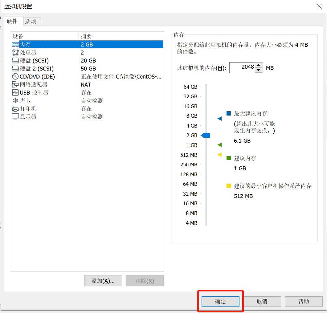 将虚拟机的内存修改为“2048”,如图所示: