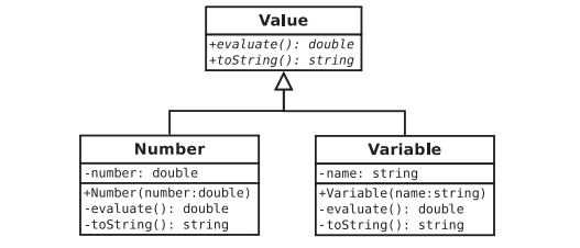 Consider the design expressed in the class diagram in Figure 8-6. This hierarchy enables both Variables and Numbers to be used interchangeably as Values. This polymorphic design solves three problems that we’ve already encountered. First, Variables and Numbers can both be stored uniformly in a Stack