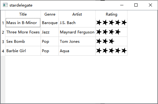 int main(int argc, char* argv[]){QApplication app(argc, argv);QTableWidget tableWidget(4, 4);tableWidget.setItemDelegate(new StarDelegate);tableWidget.setEditTriggers(QAbstractItemView::DoubleClicked| QAbstractItemView::SelectedClicked);tableWidget.setSelectionBehavior(QAbstractItemView::SelectRows);tableWidget.setHorizontalHeaderLabels({ "Title", "Genre", "Artist", "Rating" });populateTableWidget(&tableWidget);tableWidget.resizeColumnsToContents();tableWidget.resize(500, 300);tableWidget.show();return app.exec();}