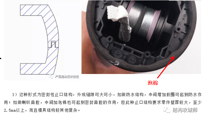 箱体不能出现漏气,特别是对于低音音箱,漏气的话会出现风噪声,所以应在箱体上下壳结合处增加泡棉密封或者点胶,甚至设计双止口结构,如下图。