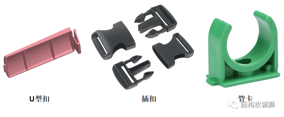 卡扣:也称卡钩、卡口、扣位,是产品结构上常用的一种连接固定结构,一般需要另一与之配合的零件实现连接效果,尤其在塑胶件上较为常见,两个零件的连接方式有很多种,之前文章有总结过: