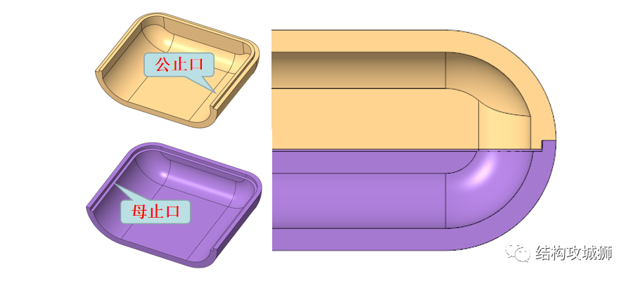 为最常见的止口,由公止口和母止口组成,从外形上看是一对凹凸的结构,这对凹凸结构分别设计在两个配合的零件上,沿着侧壁内边凸出来的部分(加胶)称为公止口,沿着侧壁内边切掉凹下去的部分(减胶)称为母止口。
