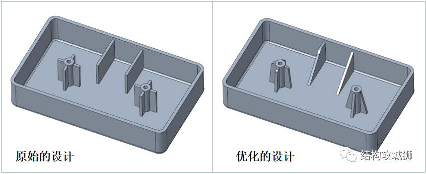 尖钢处理:加强筋与内壁连接处改成直角;在斜面上封闭的加强筋移到平面,或把封闭加强筋改为开放加强筋。