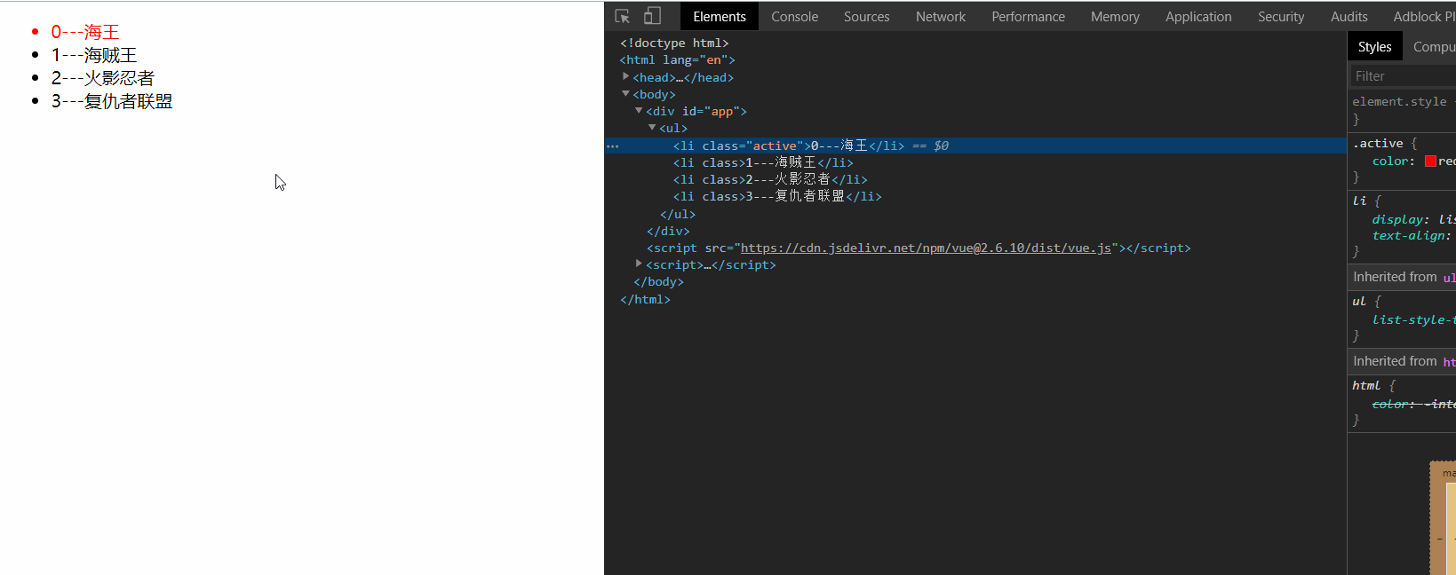 上面的语法表示 active 这个 class 存在与否将取决于数据 property isActive 的 truthiness。