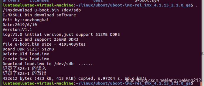 编译完成以后就使用 imxdownload 将新编译出来的 u-boot.bin 烧写到 SD 卡中测试