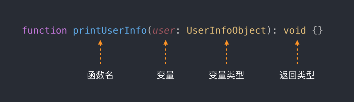 函数声明语法也有四部分组成:函数名,变量,变量类型 (基础类型(String) 和 自定义类型(UserInfoObject) ) 和 返回类型 (void)