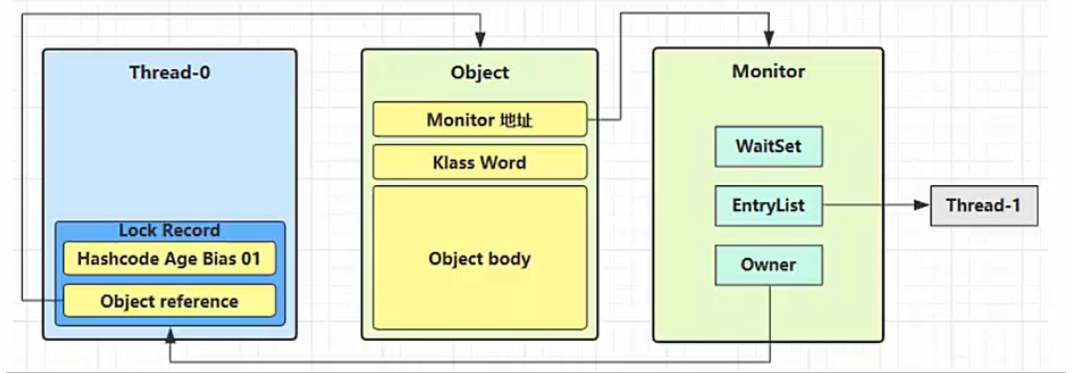 当**线程0**获得到了**锁**, 成为**Monitor**的**Owner**, 但是它发现自己想要执行**synchroized代码块**的条件没有完全满足; 此时为了避免资源浪费它就可以调用**obj.wait**方法, 进入到Monitor中的**WaitSet**集合, 此时**线程0**的状态就变为**WAITING**