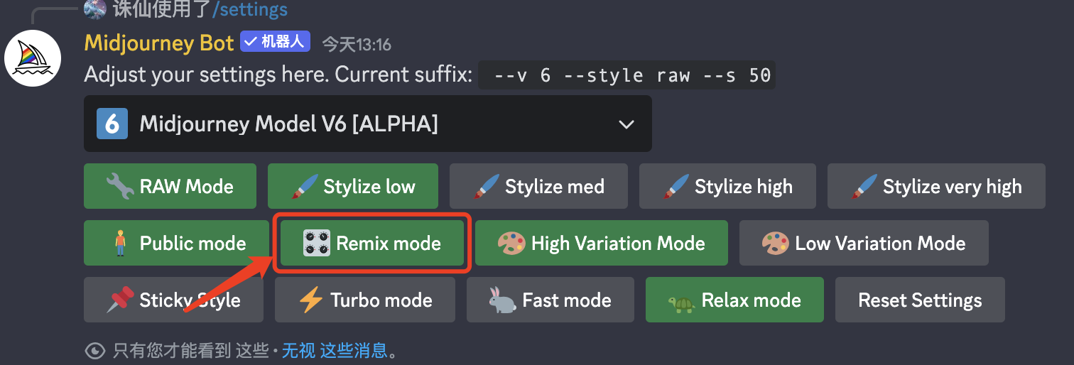 你可以通过 /setting,调整Midjourney的预设。调整完成后,后续每次生成内容都会携带这些预设参数,免去了每次填写—xxx参数的繁琐过程。