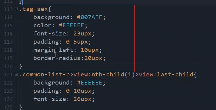 .tag-sex{background: #007AFF;color: #FFFFFF;font-size: 23upx;padding: 0 5upx;margin-left: 10upx;border-radius: 20upx;}