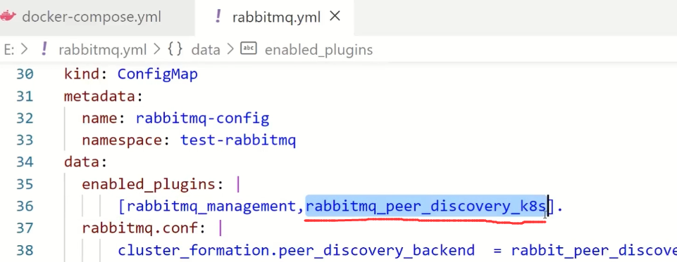 第一个插件是管控台,第二个插件是开源项目专门为了rabbitmq部署在k8s上写的一个插件,那么这个插件是做什么用的呢?我们看第二段配置也就是下面的配置就知道了。