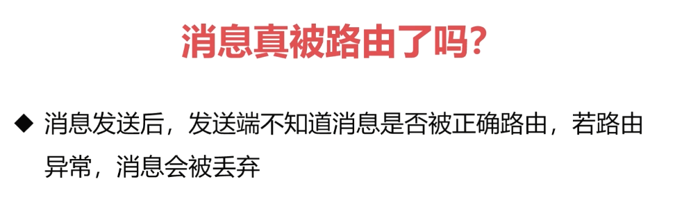 解决的问题就是消息真的被路由了吗?消息发给exchange路由到各个队列里面。如果exchange没有相应的路由规则,那么这条消息就被丢弃了。我们可以做一个特殊的设置,让exchange在路由消息的时候,如果没有找到对应的队列。可以不丢弃这条消息。将这条消息给返回回来。