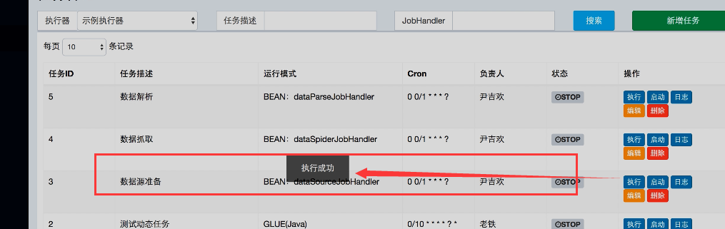 开始结束 开始父任务执行成功了,结束后,触发下一个子任务的执行。 例如任务B依赖任务A处理的结果。前一个任务把处理结果放到数据库或者是缓存内 提供给下一个子任务 模拟的代码 ,首先是数据源的准备抓取的任务 抓取后触发数据的解析 抓取的子任务就是5执行一次 数据源的准备 下面的两个任务都是通过子任务去触发的。 假设我们子任务去掉执行父任务抓取没有执行。 结束