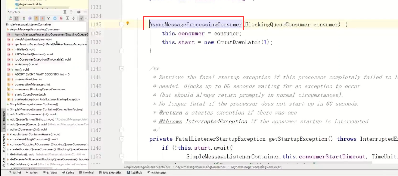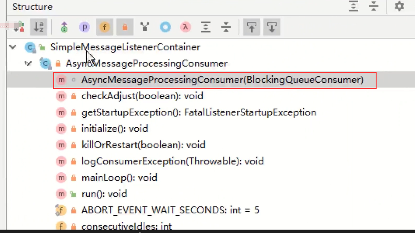 我们发现AsyncMessageProcessingConsumer是SimpleMessageListenerContainer的内部类