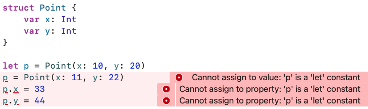 struct Point {var x: Intvar y: Int}var p1 = Point(x: 10, y: 20)p1 = Point(x: 11, y: 22)