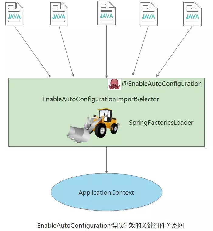 其中,最关键的要属@Import(EnableAutoConfigurationImportSelector.class),借助EnableAutoConfigurationImportSelector,@EnableAutoConfiguration可以帮助SpringBoot应用将所有符合条件的@Configuration配置都加载到当前SpringBoot创建并使用的IoC容器。就像一只“八爪鱼”一样,借助于Spring框架原有的一个工具类:SpringFactoriesLoader的支持,@EnableAutoConfiguration可以智能的自动配置功效才得以大功告成!