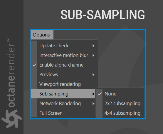 The Sub-sampling sub-menu controls the amount of sub-sampling in the Live Viewer display. This option can provide smoother scene interaction by reducing the render resolution when navigating within the scene, creating a pixelated preview effect. Once navigation ceases, the display returns to full resolution. The options are discussed below: