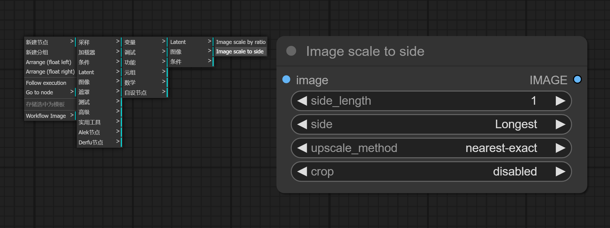 - 我们“新建节点——Derfu节点(Derfu_Nodes)——自设节点——图像——Image scale to side”,这时候我们就可以删掉“图片缩放”换成“Image scale to side”了;